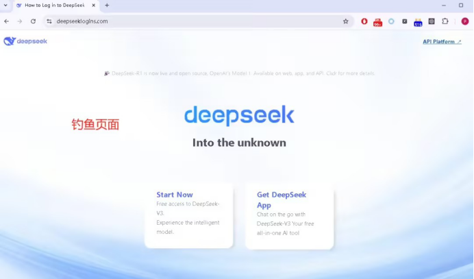 以釣魚網(wǎng)站“https://deepseeklogins.com/”為例,其頁面結構和風格與 DeepSeek 官方網(wǎng)站高度相似,旨在通過偽造官方頁面來誘導用戶泄露敏感信息。與真實網(wǎng)站相比,釣魚頁面移除了中英文切換的超鏈接。在該釣魚頁面中,點擊右上角的“API Platform”鏈接將會引導用戶跳轉到偽造的登錄頁面。