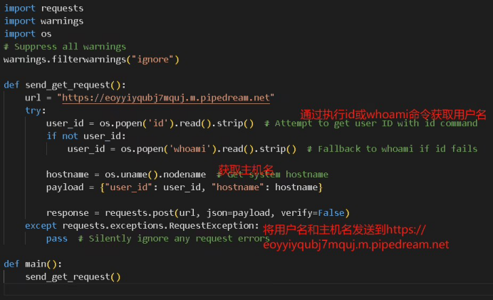 從代碼的注釋風格和結構化編寫方式來看,兩段惡意腳本可能是在 AI 的輔助下生成的。例如,代碼中的典型注釋格式(如# Suppress all warnings、# Attempt to get user ID with id command)以及代碼邏輯的組織方式,符合 AI 生成代碼的常見特點。此外,代碼采用了異常靜默處理(pass 語句),以及禁用 SSL 證書驗證(verify=False),這些也是 AI 生成代碼時可能出現(xiàn)的模式。