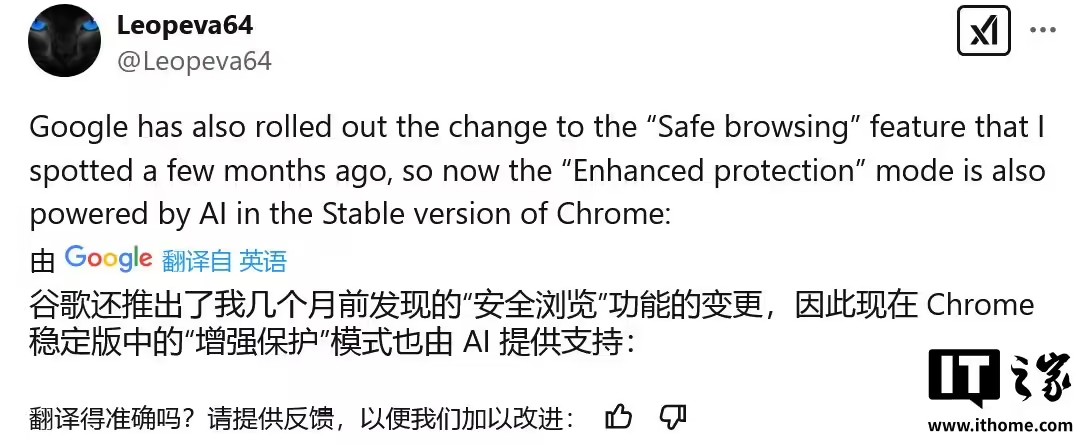 IT之家 2 月 17 日消息,消息源 @Leopeva64 昨日(2 月 16 日)在 X 平臺(tái)發(fā)布推文,稱(chēng)在經(jīng)過(guò) 3 個(gè)月的 Canary 頻道測(cè)試后,谷歌 Chrome 瀏覽器穩(wěn)定版已全平臺(tái)上線(xiàn)全新“增強(qiáng)保護(hù)”(Enhanced protection)功能,在現(xiàn)有功能基礎(chǔ)上,通過(guò) AI 實(shí)時(shí)防護(hù)危險(xiǎn)網(wǎng)站、下載和擴(kuò)展程序等。